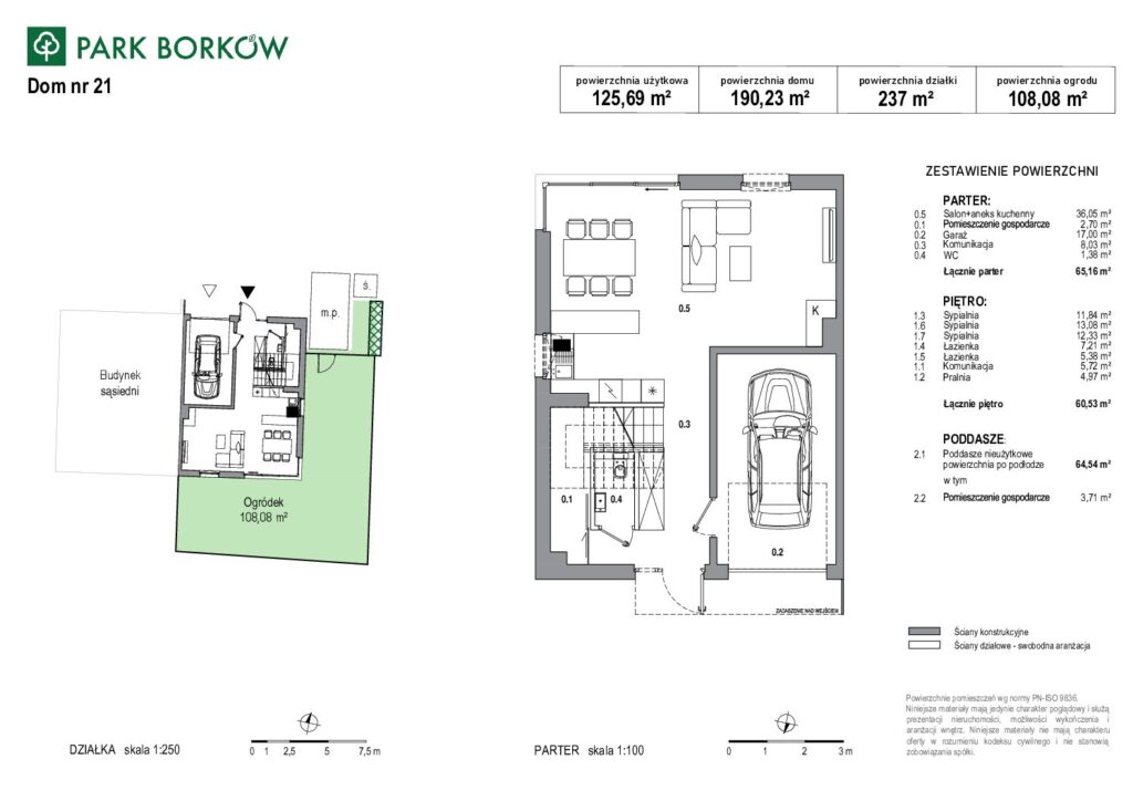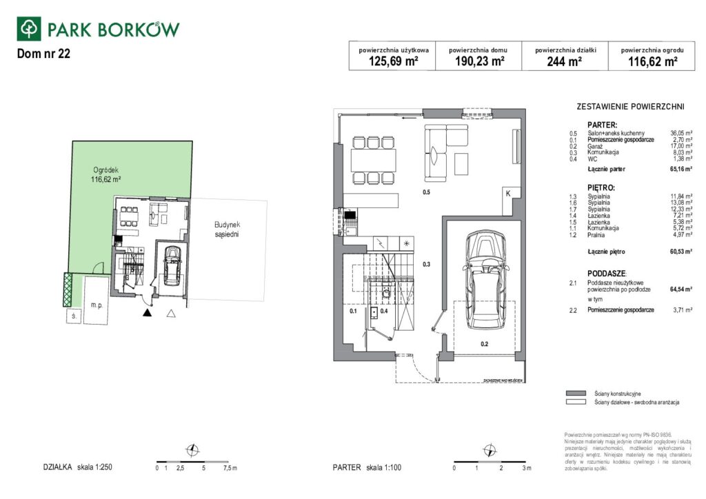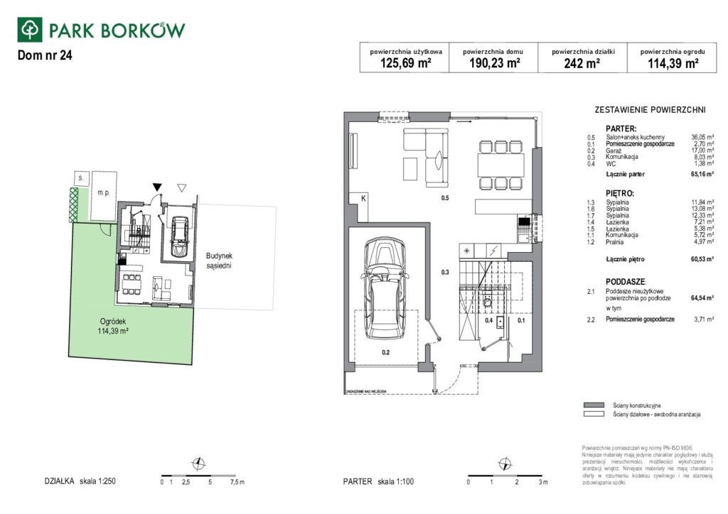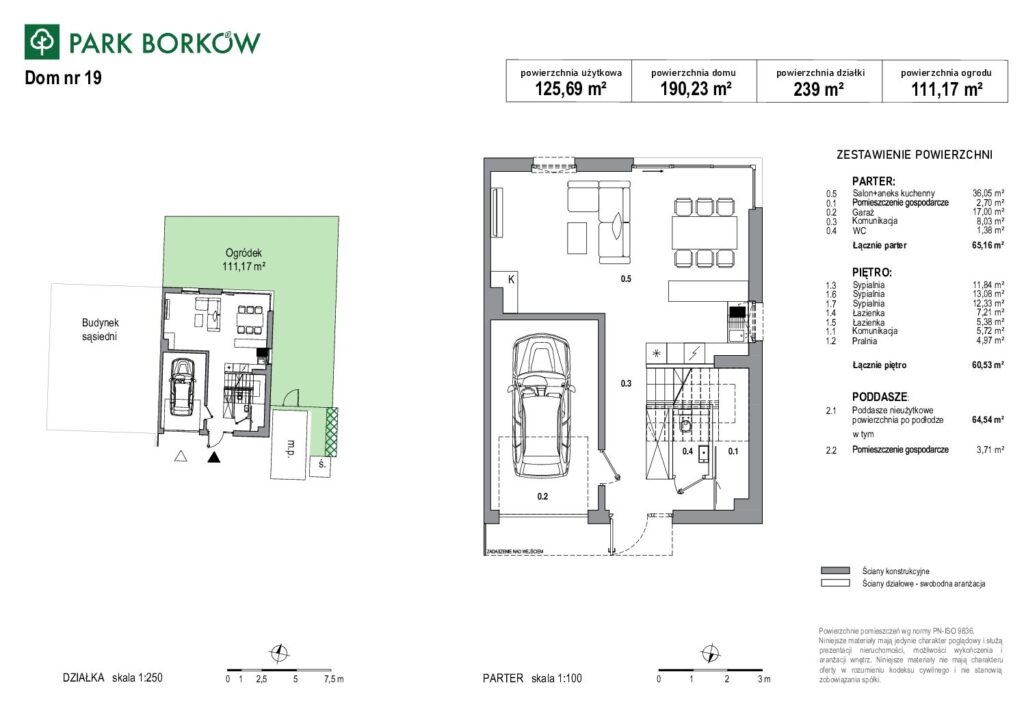 Układ i powierzchnia każdego domu jest identyczna: 190 m2 powierzchni domu składa się ze 125 m2 na parterze i piętrze 1 wraz z wysokim (do 2,75 m) i bardzo doświetlonym poddaszem o powierzchni 65 m2 do indywidualnej aranżacji.