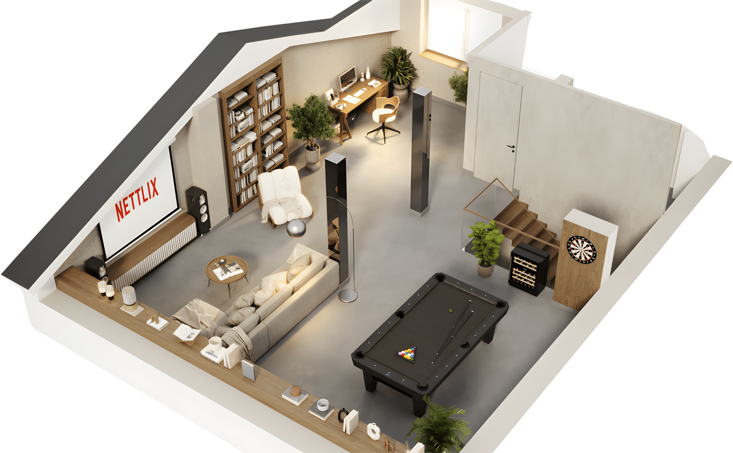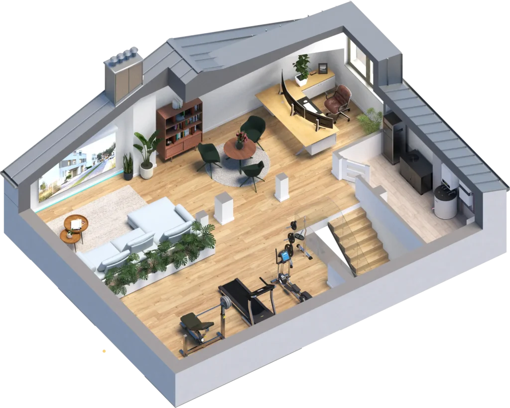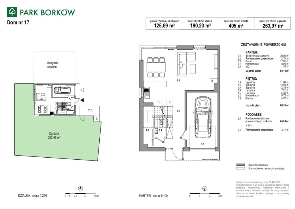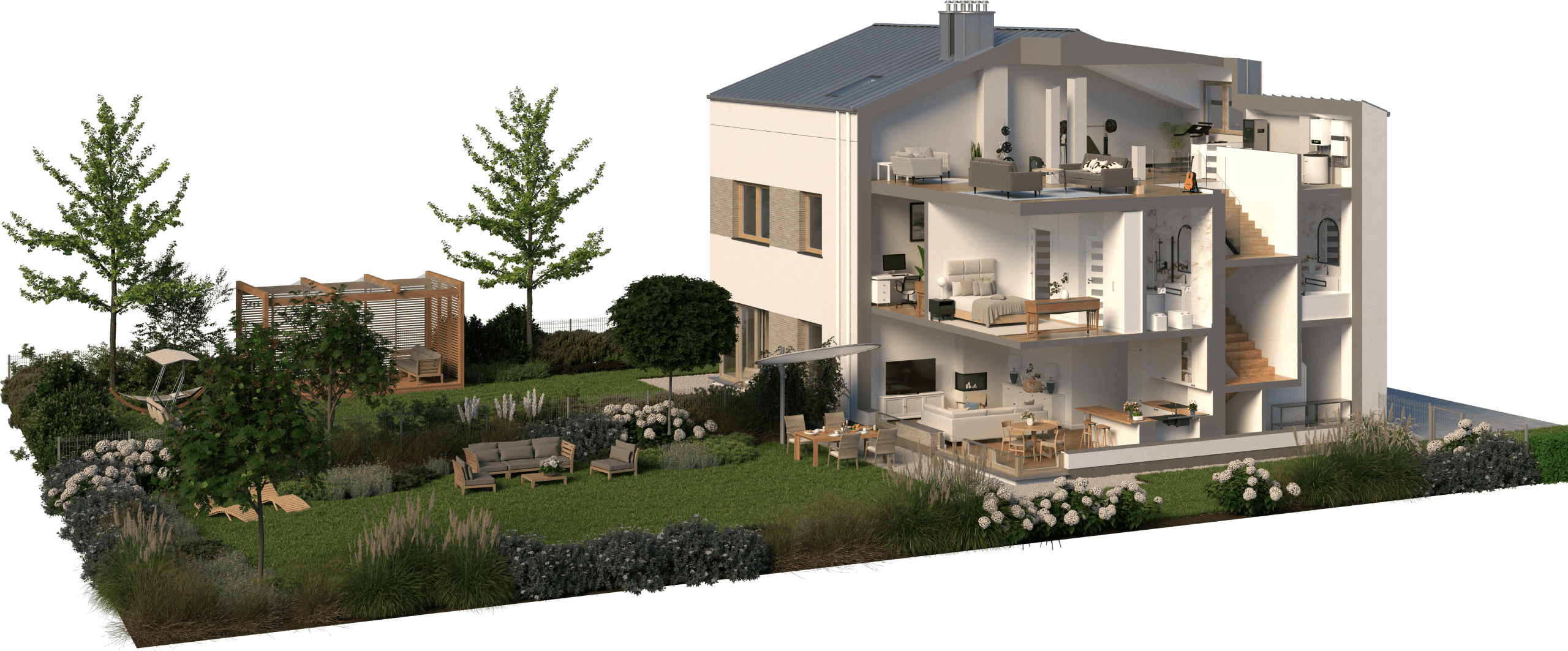 Układ i powierzchnia każdego domu jest identyczna: 190 m2 powierzchni domu składa się ze 125 m2 na parterze i piętrze 1 wraz z wysokim (do 2,75 m) i bardzo doświetlonym poddaszem o powierzchni 65 m2 do indywidualnej aranżacji.