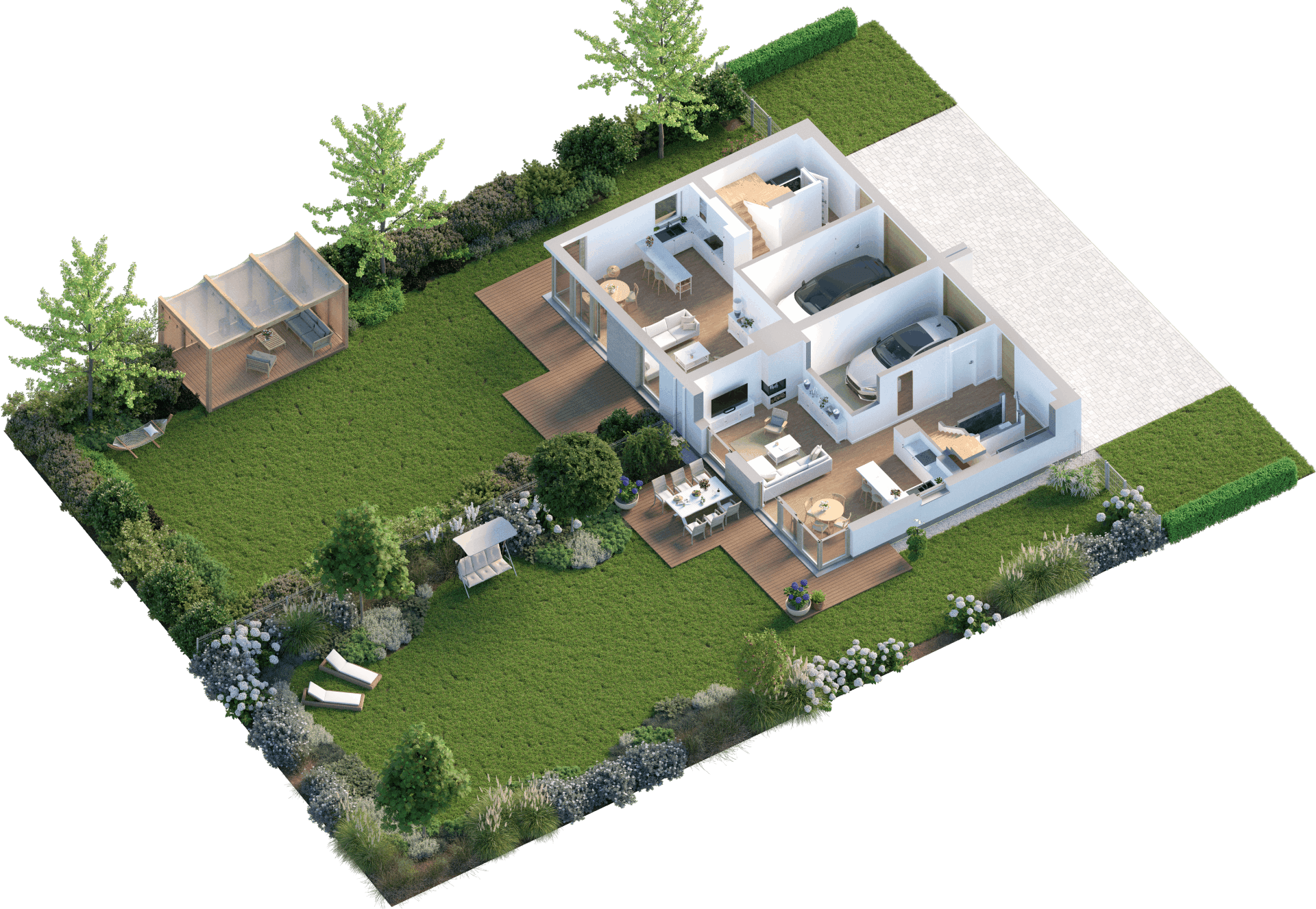 Każdy dom w naszej inwestycji ma taki sam układ pomieszczeń i rozmiar. Domy różnią się wielkością działki od 237 do 430 m².